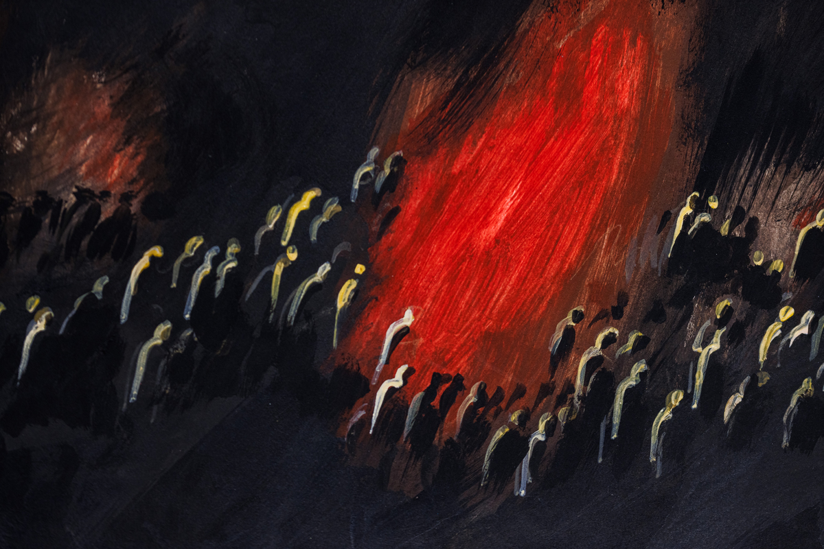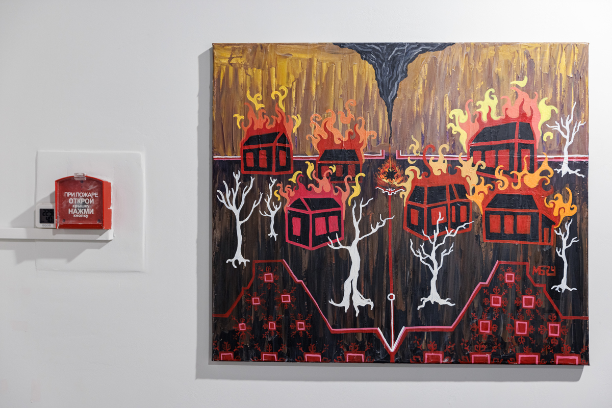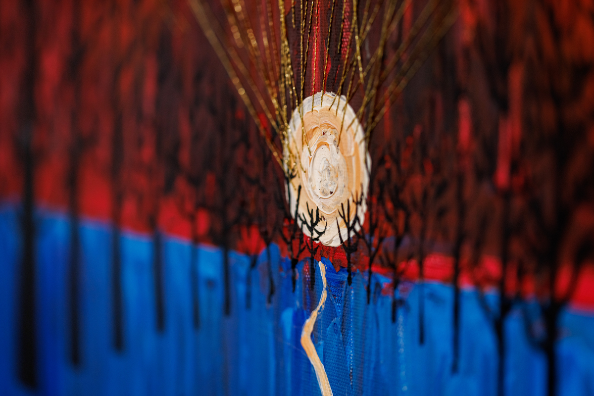 Художник из Йошкар-Олы Марк Берман внедряет на свои полотна ветки из священной рощи, в которой марийцы уже не проводят обряды. Он исследует мистику заколдованных марийских лесов, используя визуальный стиль массовой культуры, отсылающий нас к формату комиксов и аниме. Картинам Марка присущ особый символизм — через тонкие детали он раскрывает противоречивые и поучительные истории о марийских божествах. Наиболее поэтична, наверное, история о Небесной деве. Ее веретено у марийцев считается великой осью, вокруг которой вращается все мироздание. Неспроста образ веретена появляется и на лаконичных полотнах Агафонова рядом с его бабушками по материнской и отцовской линии. А что будет, если та тонкая связующая времен вдруг оборвется?