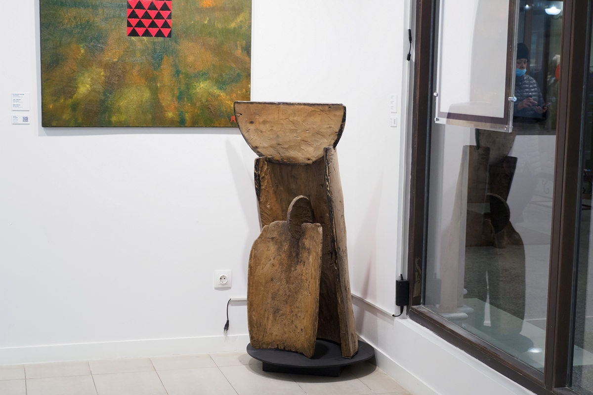 — Как я уже говорил, мы провели тщательный отбор. Я в основном брал работы проектные. Мне не хотелось делать смешанный винегрет, а, наоборот, хотелось цельности, чтобы художник выставлял какой-то определенный проект. Такой был главный критерий. Ну и, конечно, особое внимание уделялось медиумам: у нас есть работы в технике батик, акрил, холст и масло, шариковая ручка, пастель. Также представлены скульптуры Аделя Халиуллина, арт-объекты Ильдара Гильманова. Я тоже отправил две. Первая — деревянная скульптура «Степная Мадонна». Я ее делал в Удмуртии на симпозиуме. Там у меня сам собой образовался проект, где я делаю деревянные объекты из собранной в заброшенных домах утвари. Я нашел корыто, добавил другие предметы, переработал, что-то поменял и сделал совершенно новый объект. Он похож на балбалы, только не каменный, а деревянный. Такая отсылка к архаичным памятникам тюркской истории. Я смешал в ней финно-угорский и тюркский дух. Оставил текстуру древесины, где-то затонировал, сохранил все трещины, дефекты.