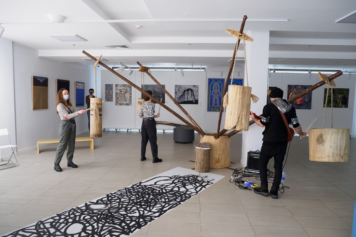 Второй объект — «Тангыра» — создан в 2018 году. Мы тогда должны были сделать финно-угорский проект, связанный с музыкальным инструментами. И опять из бытовых доступных объектов я решил сделать предмет, из которого можно было бы извлечь звук. Мы обнаружили старые ступы. Их было много, разных размеров и форм. Нашли жерди. Почистили, обработали, собрали. Получился такой ударный инструмент. Сыграли на нем вместе с музыкантами и местными бабушками. Теперь этот объект — достопримечательность села Булай Увинского района. На ней уже много народу поиграло за эти годы, прямо видно много-много маленьких вмятин от ударов. На выставке в «БИЗОNе» мы тоже обязательно сыграем вместе со зрителями!