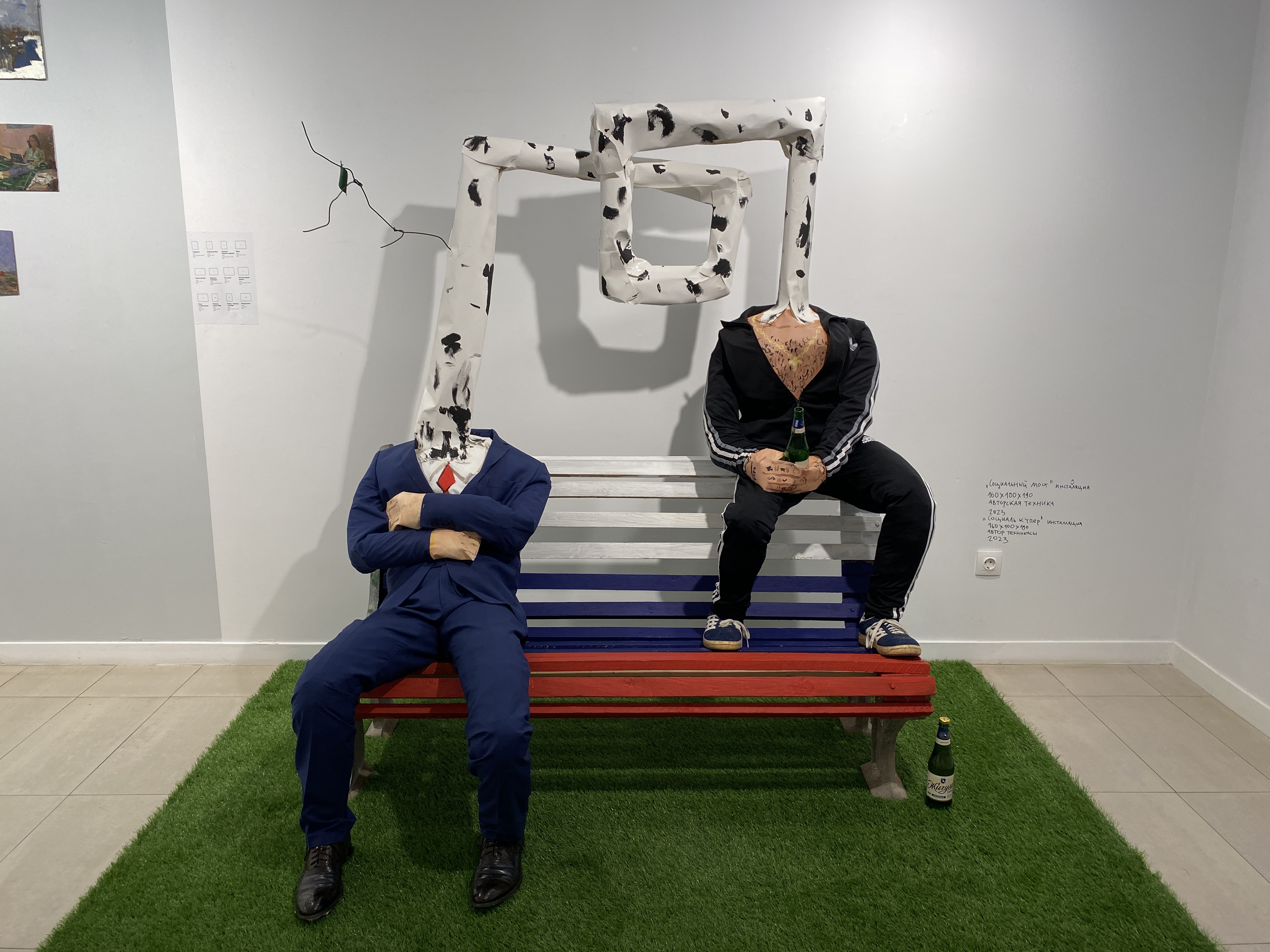 Экспозиция в «БИЗONе» открывается масштабной инсталляцией «Социальный мост» по моей одноименной картине. Я приехал в Казань за неделю до выставки и сделал ее с нуля. Это новый опыт для меня — столь крупную скульптурную композицию я создал впервые. Сюжет выбран неслучайно. Тема социальных мостов очень глубокая, и, думаю, в рамках одноименной картины я до конца ее не раскрыл. Все же картина — нарисованный образ, а инсталляция материальна, а значит, более выразительна. Я использовал в ней настоящие костюмы и скамейку. У зрителя будет возможность посидеть вместе с моими героями.