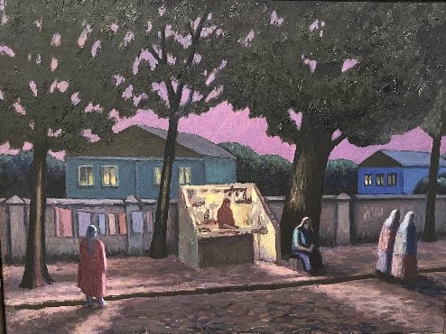 Как «человек дороги» Акилов постоянно перемещается не только в реальности, но и в памяти. Он пишет не столько то, что видит здесь и сейчас, сколько образы своей юности — тот самый зеленый город-сад Душанбе, построенный его родителями. Там журчат арыки, кроны деревьев возвышаются над улицами, а солнечные блики оживляют тенистые улочки.
