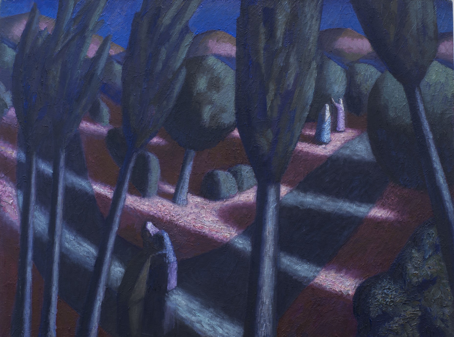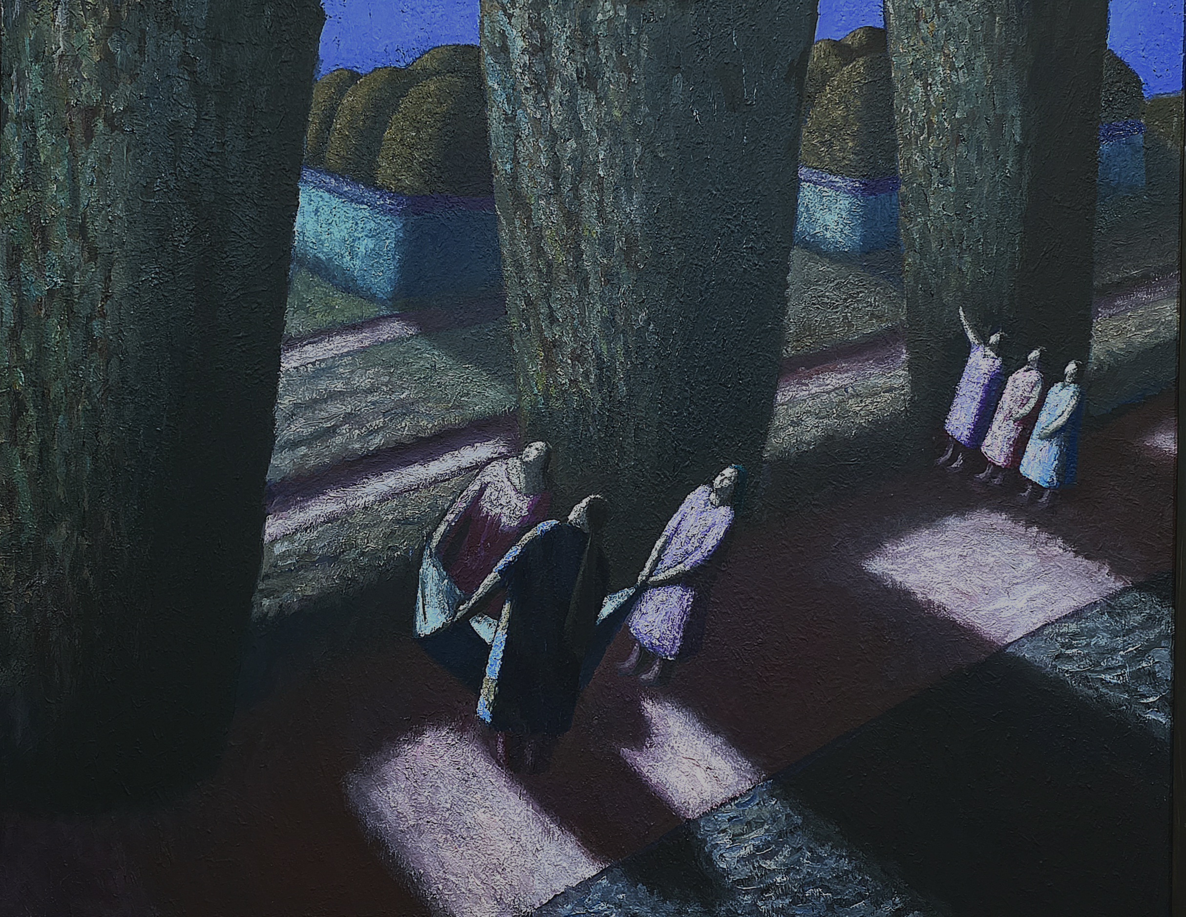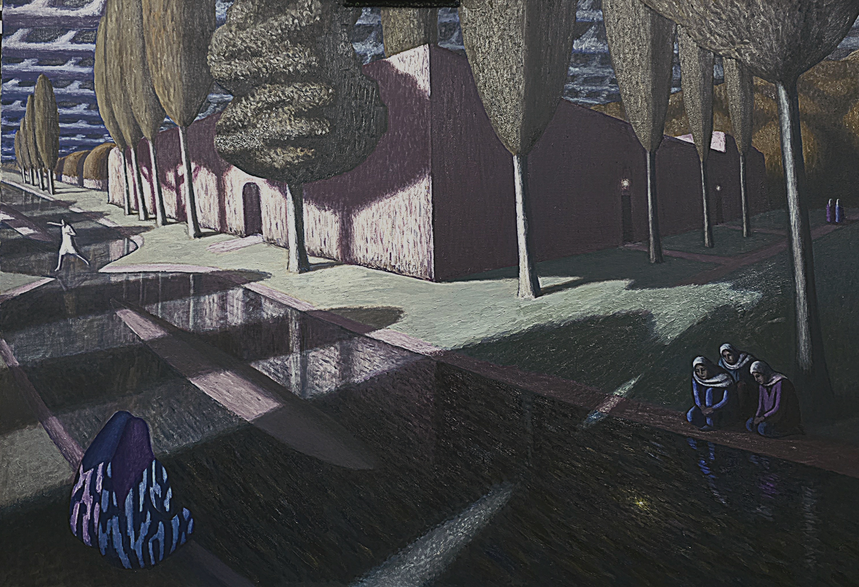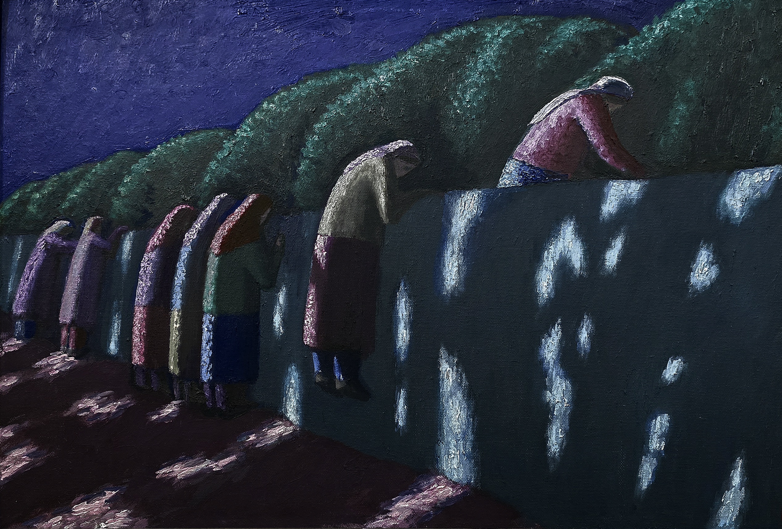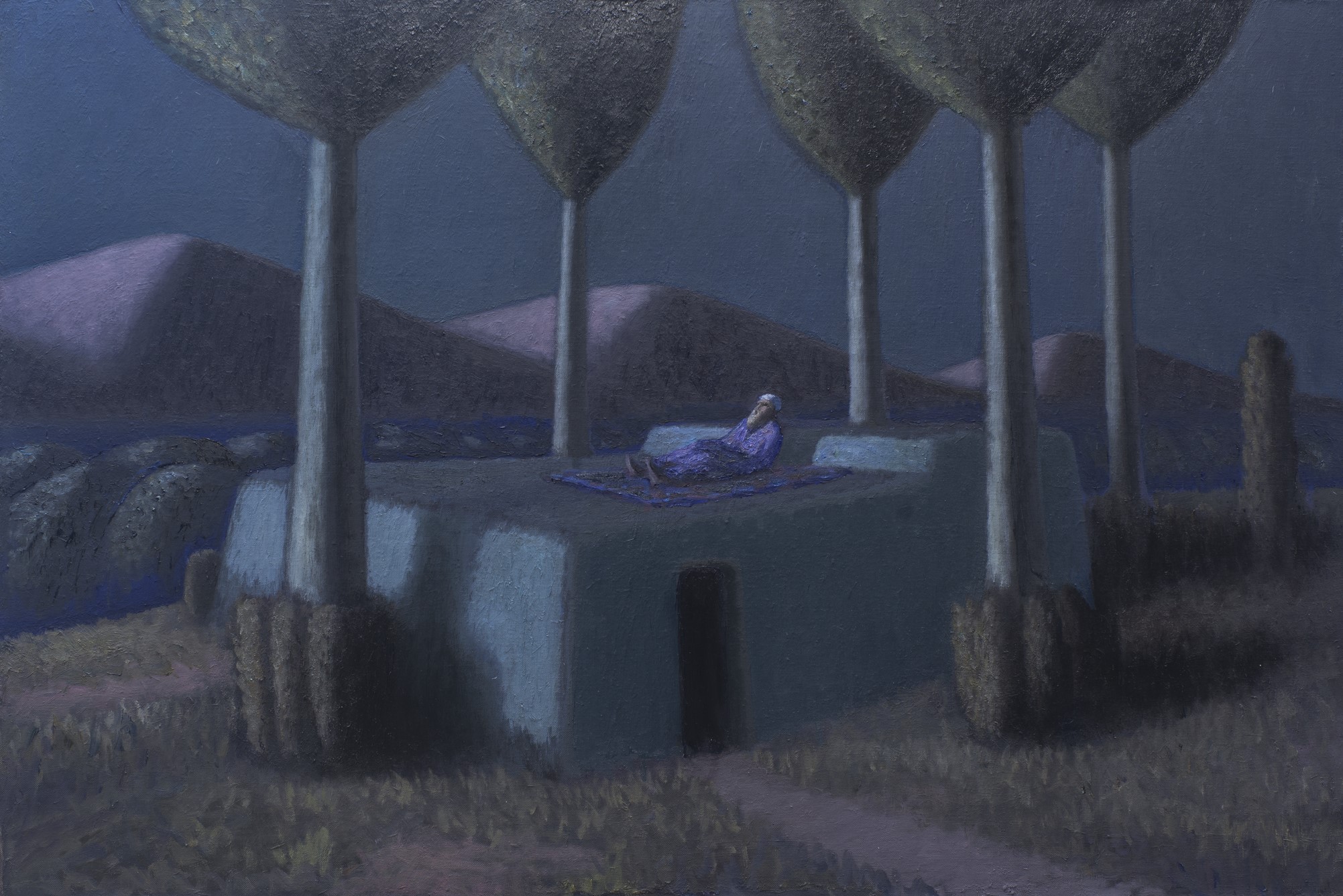 — Мы не ставили перед собой задачу показать эволюцию метода в хронологии. Художник по-прежнему движется между сном и явью, возвращаясь к своим воспоминаниям. Ранние работы, 1980–1990 годов, почти не сохранились в его мастерской — они давно разошлись по музеям и частным коллекциям. Однако важно отметить, что в тот период его живопись была более сюрреалистичной. В то время доступ к альбомам западных художников был ограничен, и любые подобные издания становились настоящей ценностью. Сюрреализм завораживал, оказывал сильное влияние — его отголоски заметны, например, в картине «Ночь» (2000): неподвижные, почти каменные кроны деревьев и облака, две женщины на фоне неба, простые по форме дома и одинокая фигура бабая вдали.