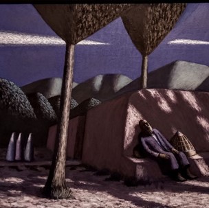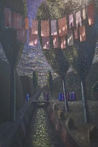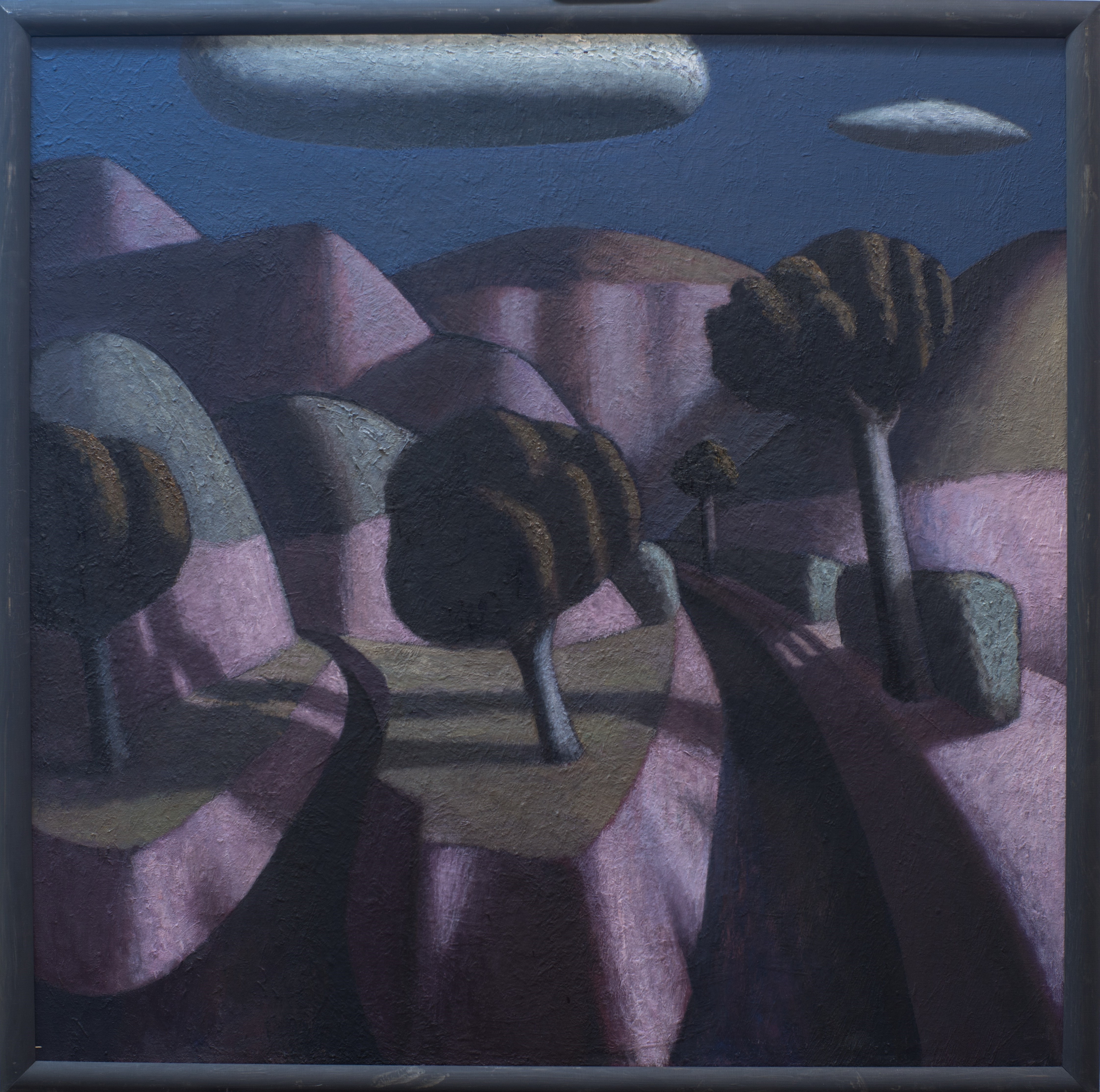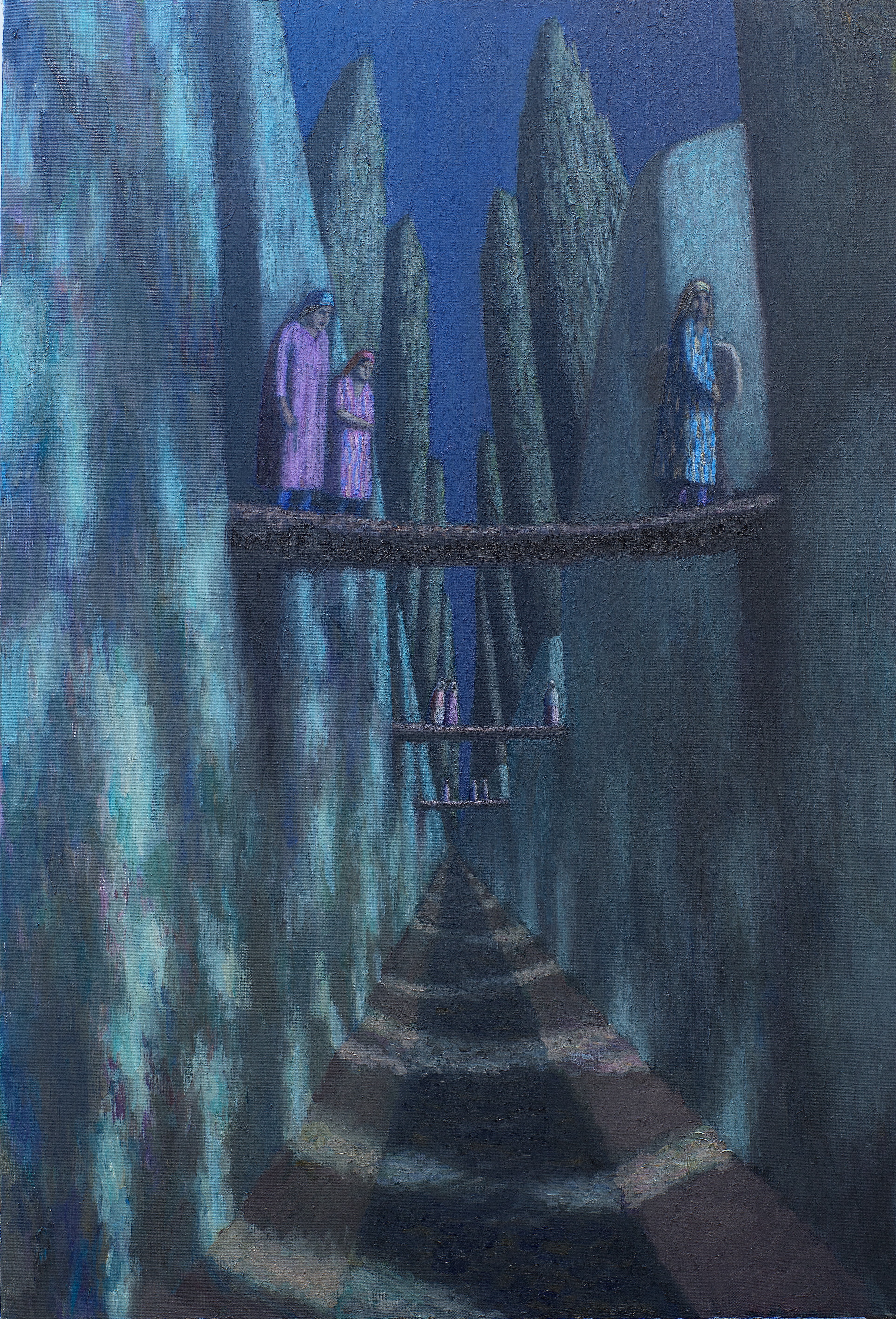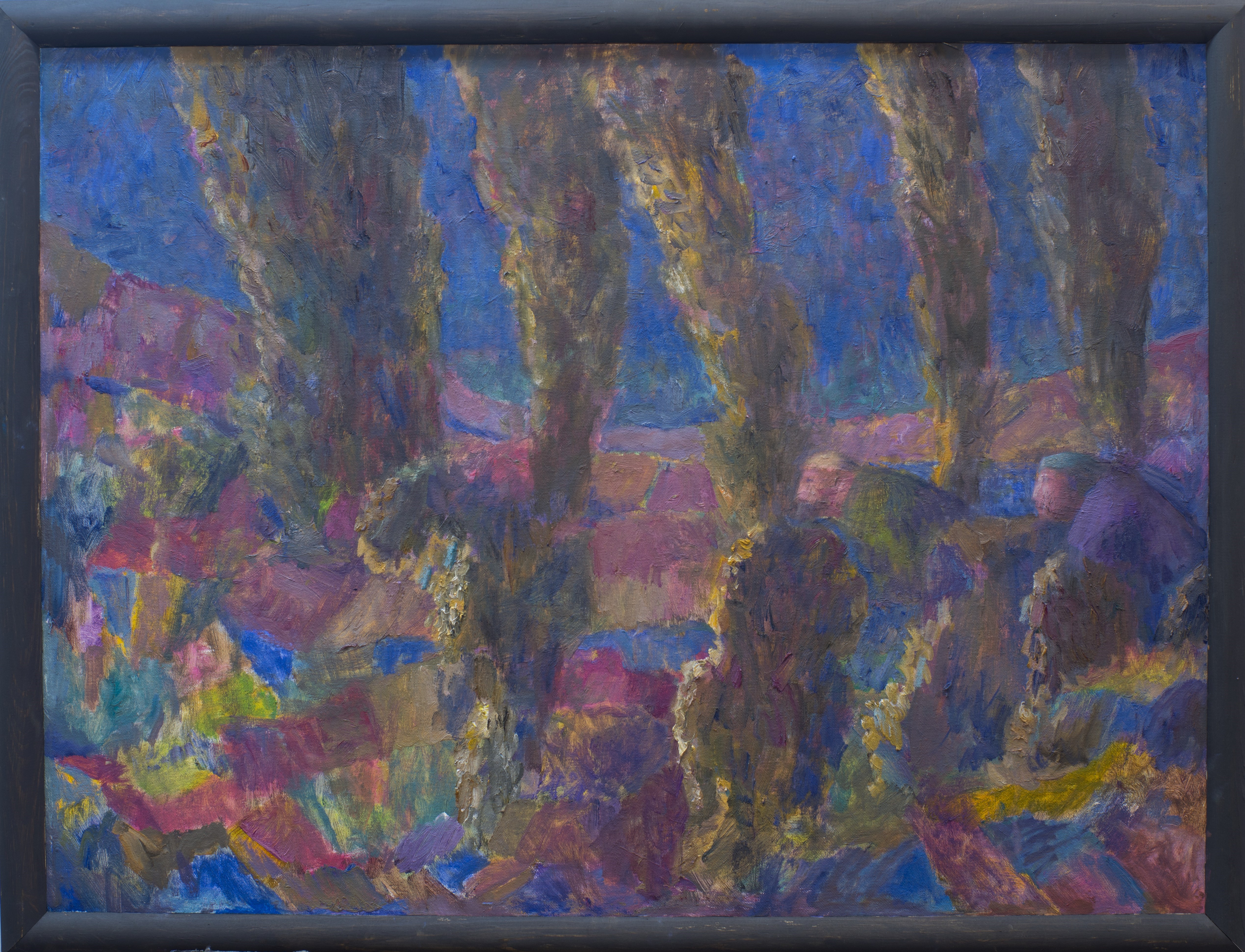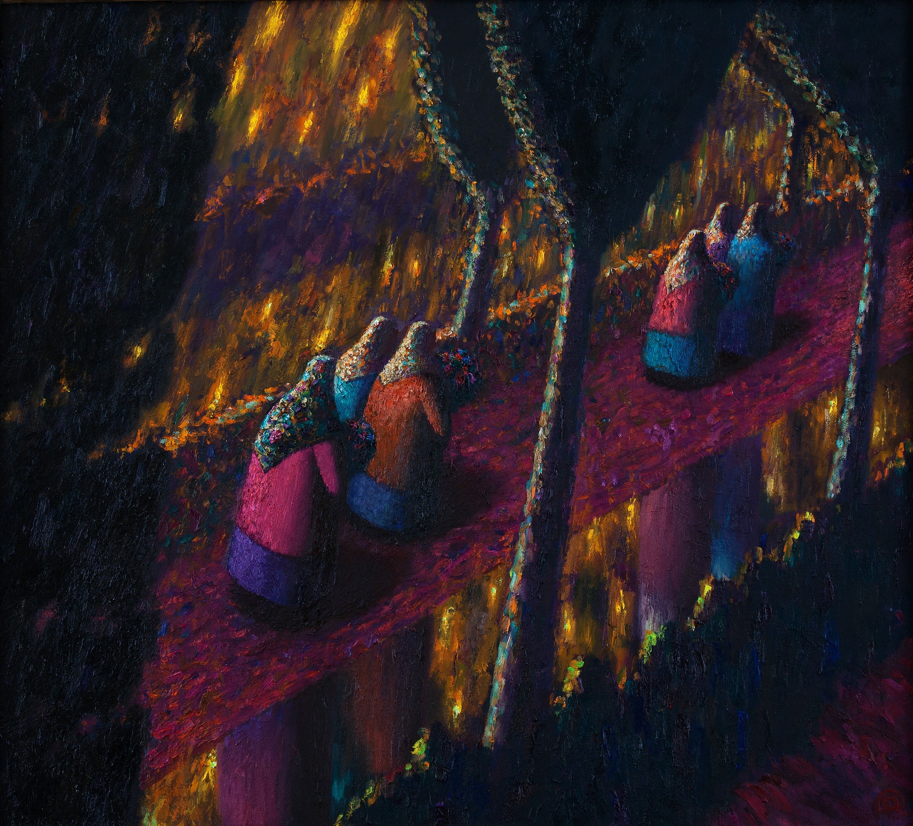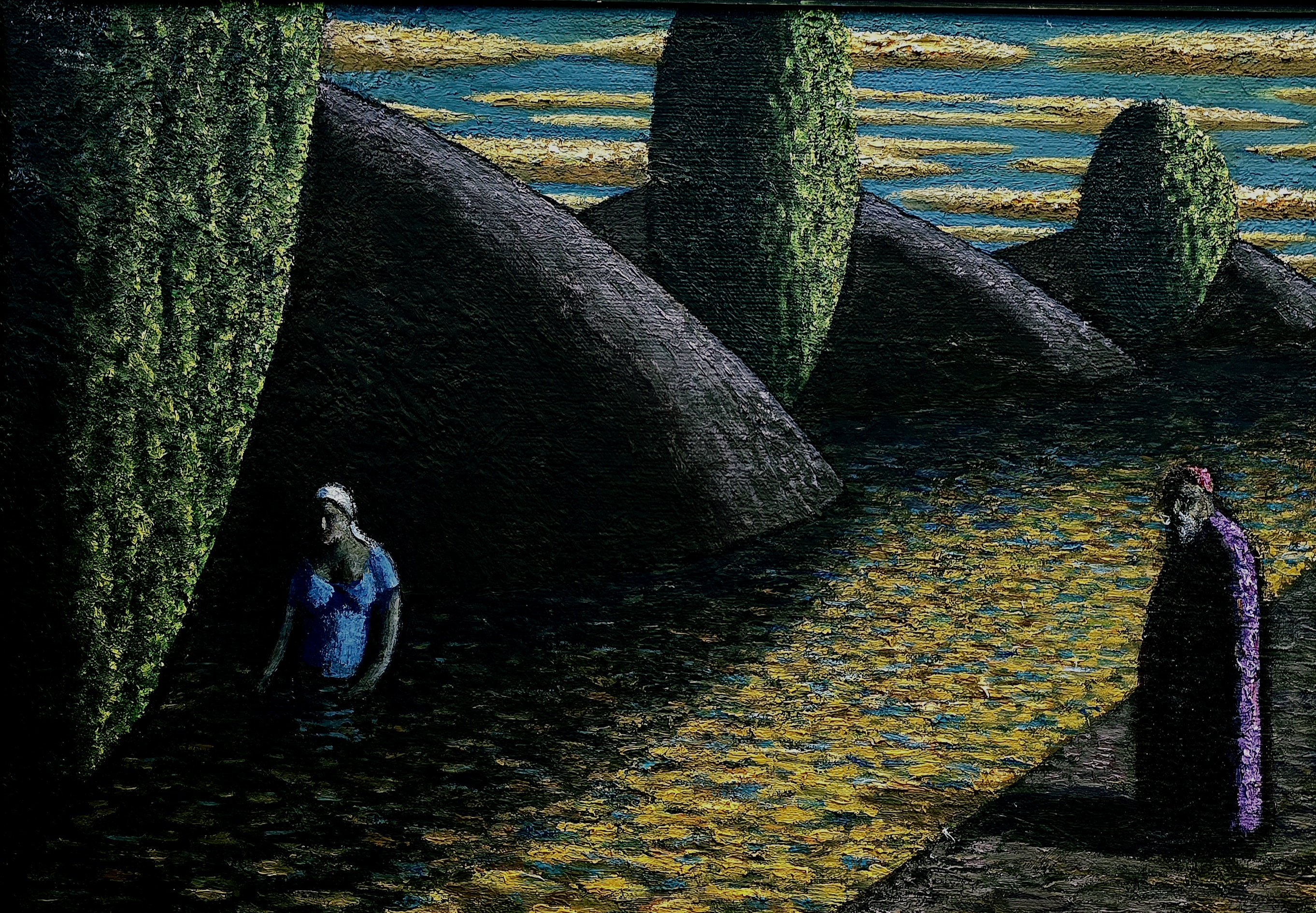 — Мы не ставили перед собой задачу показать эволюцию метода в хронологии. Художник по-прежнему движется между сном и явью, возвращаясь к своим воспоминаниям. Ранние работы, 1980–1990 годов, почти не сохранились в его мастерской — они давно разошлись по музеям и частным коллекциям. Однако важно отметить, что в тот период его живопись была более сюрреалистичной. В то время доступ к альбомам западных художников был ограничен, и любые подобные издания становились настоящей ценностью. Сюрреализм завораживал, оказывал сильное влияние — его отголоски заметны, например, в картине «Ночь» (2000): неподвижные, почти каменные кроны деревьев и облака, две женщины на фоне неба, простые по форме дома и одинокая фигура бабая вдали.