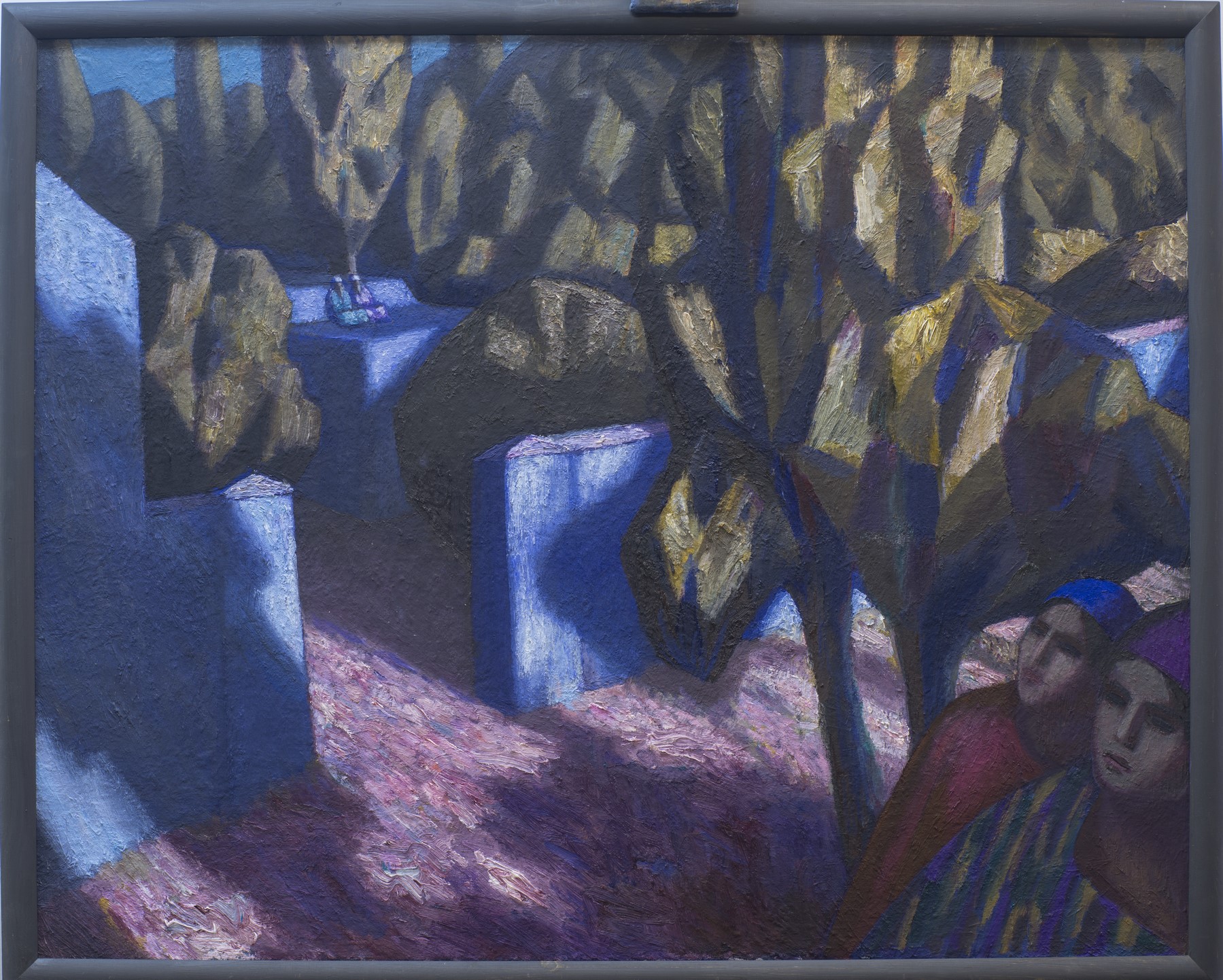 Почему герои изображены фрагментарно? Во-первых, такой стиль был распространен у некоторых художников 1970–1980 годов. Во-вторых, так мастер уходит от реализма. «Поэты» импрессионистичны, их сложно разглядеть с первого раза, они теряются в дробленом воздухе и становятся частью пространства. Может, это вовсе не те, кто пишет стихи, а просто люди с поэтическим складом ума, некие таджикские мужчины, которые ночью направляются к святому человеку? По древней суфийской традиции в горах Таджикистана можно встретить мудрецов, что основывают свои сообщества и помогают найти ответы на тревожащие вопросы.