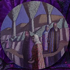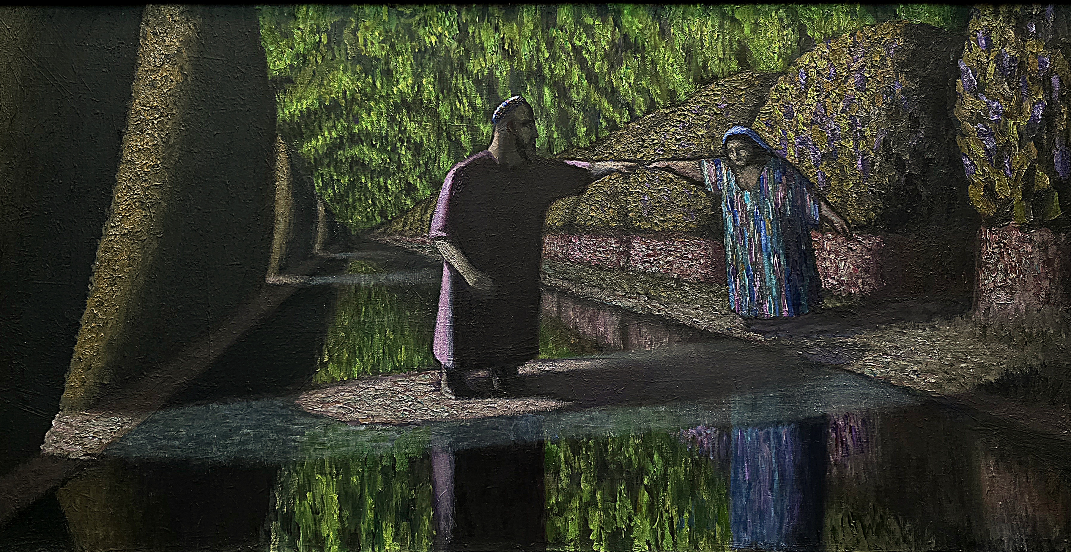 Я и сама услышала много нового, например о его последней работе «Гость». Картина круглая — удачный эксперимент по живописной пластике в стиле фресок Джотто ди Бондоне. В Таджикистане есть православные храмы, и Александр изобразил приезжего священника, окруженного местными жителями, — человека иной культуры и религиозной традиции. Он отличается, но при этом органично вписан в среду.