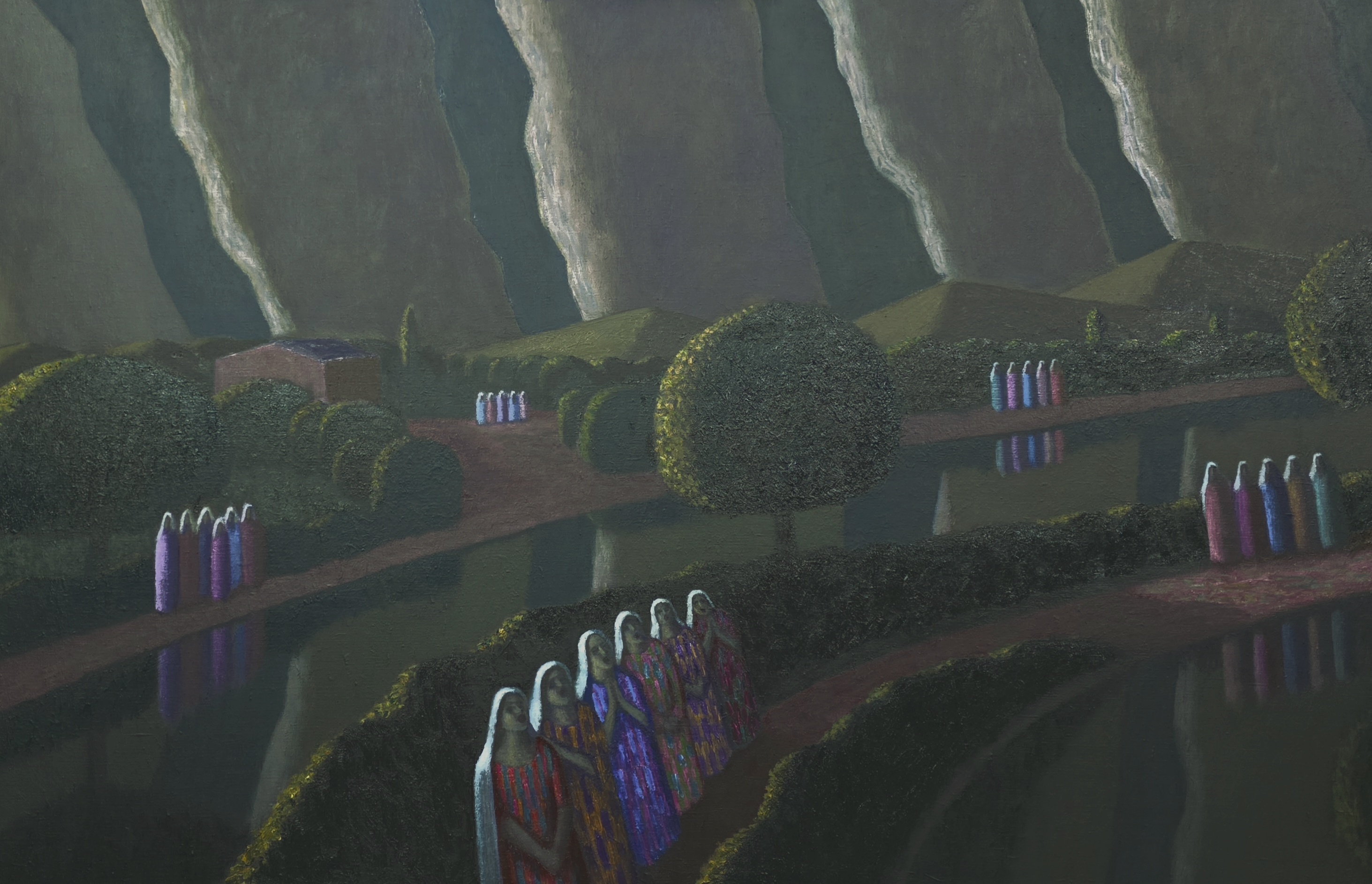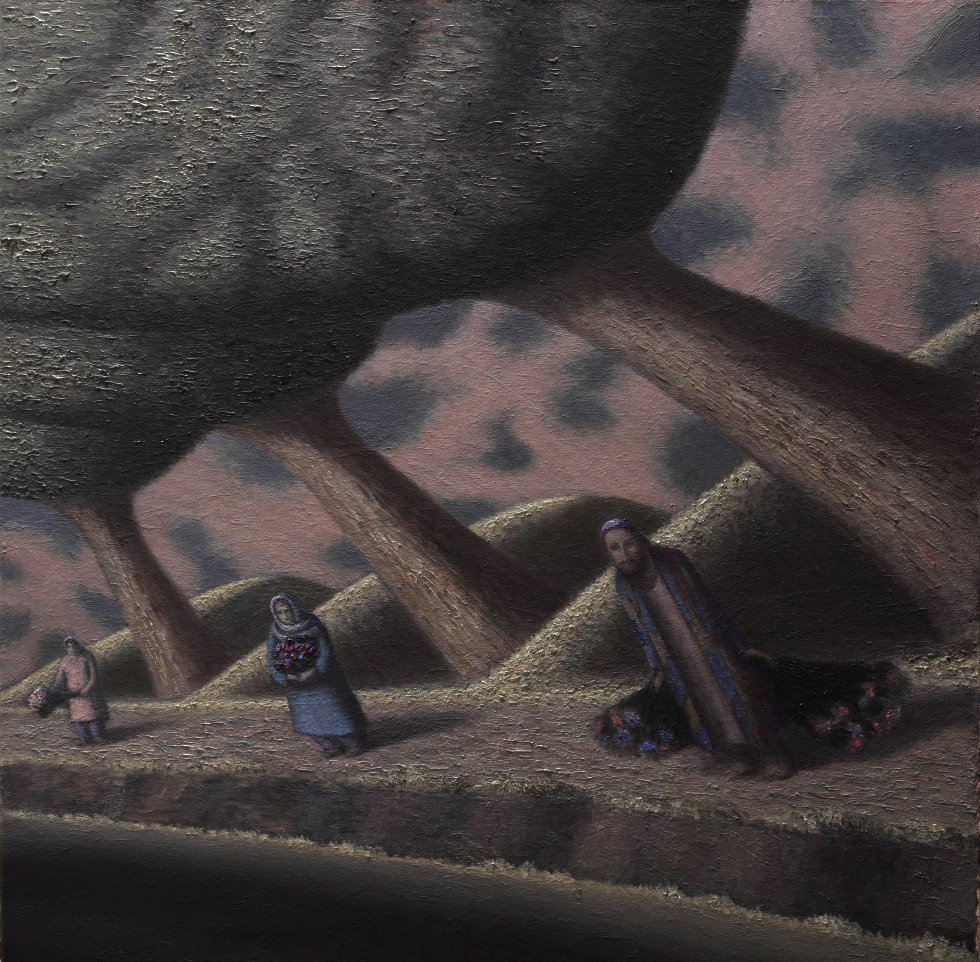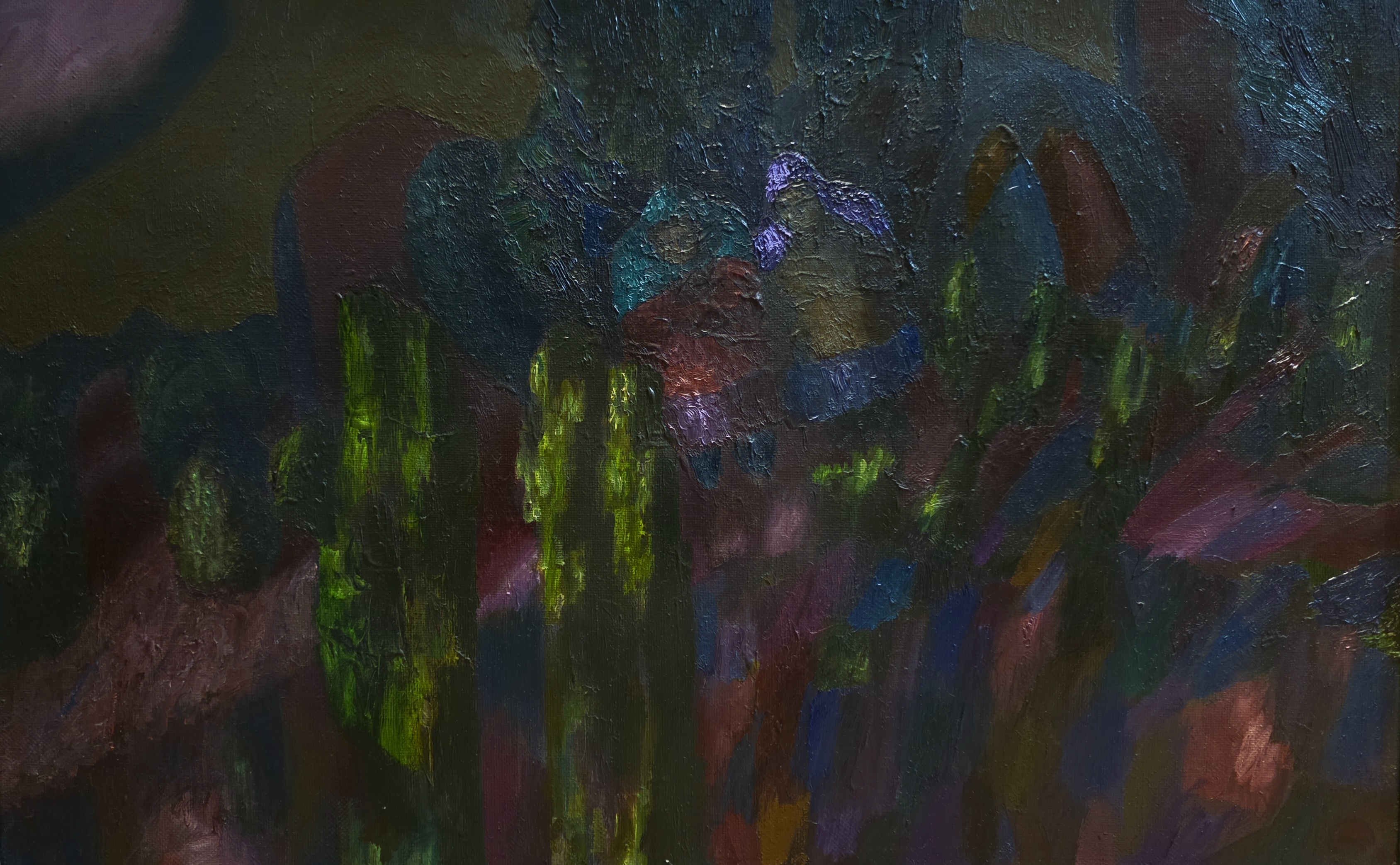 — Мы отталкиваемся от идеи постижения мира через созерцание, и я бы не сказала, что творчество Александра пронизано тревогой. Драматические работы есть, например картина «Хор», созданная специально к выставке. Она связана с политической ситуацией в мире — Александр проводит параллели с проблемой, постигшей Иран, и это отразилось в работе: странные всполохи на небе, группы женщин, которые стоят рядами и смотрят в небо. Раздается хор природы и женских голосов…