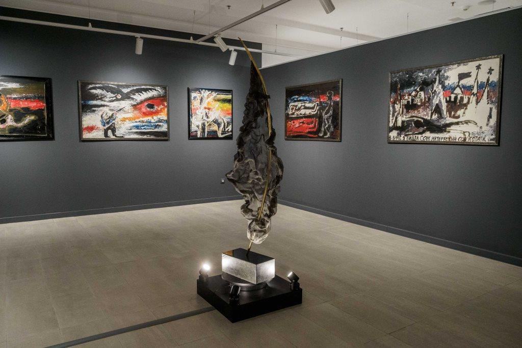 — У Зиннура необычная стилистика, и определить, что в ней преобладает, сложно. Его картины могут возникнуть и на пещерном камне, и на самых новых холстах. Миннахметов пишет современные автомобили, самолеты, особняки, но они выглядят как петроглифы. Он словно маскируется под первобытного художника и не придерживается знаний «анатомии», пропуская мир через свои эмоции и предпочтения. Мастер не стремится угодить зрителю и создать красоту в привычном понимании. Однако все его работы высокоэстетичны. На мой взгляд, лучшей частью казанской экспозиции стал Темный зал, где представлены полотна Миннахметова времен 90-х, а также масштабная скульптура Халиуллина «Свобода» на вращающейся платформе. Ее размер — более 1,5 метра.