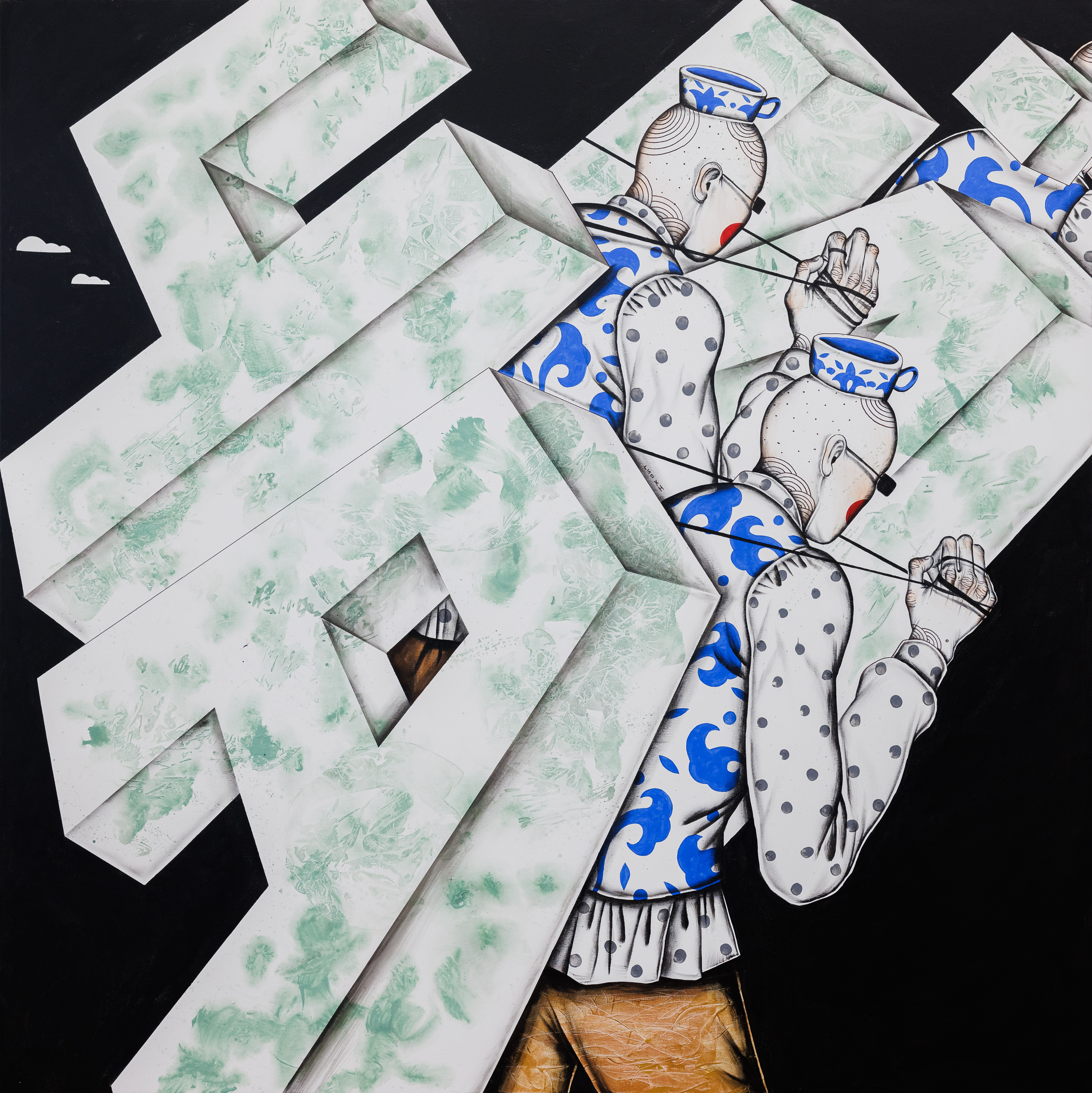 Мы видим колоритных купцов в солнцезащитных очках: это не просто торговцы, а сложные персонажи, в лицах которых читается и мудрость, и хитрость, и усталость от долгих дорог. Их яркие, пестрые одежды, словно сошедшие с исторических гравюр, контрастируют с сюрреалистическим фоном, подчеркивая связь времен. Они символизируют не только коммерцию, но и культурный обмен, ведь вместе с чаем они несли идеи, знания и традиции из Китая в Россию и обратно. В их взглядах отражение азарта сделки, предвкушение прибыли, но также и уважение к партнеру, понимание важности долгосрочных отношений. Си Ло красноречиво показывает, что за сухим языком цифр и контрактов всегда стоят человеческие истории.