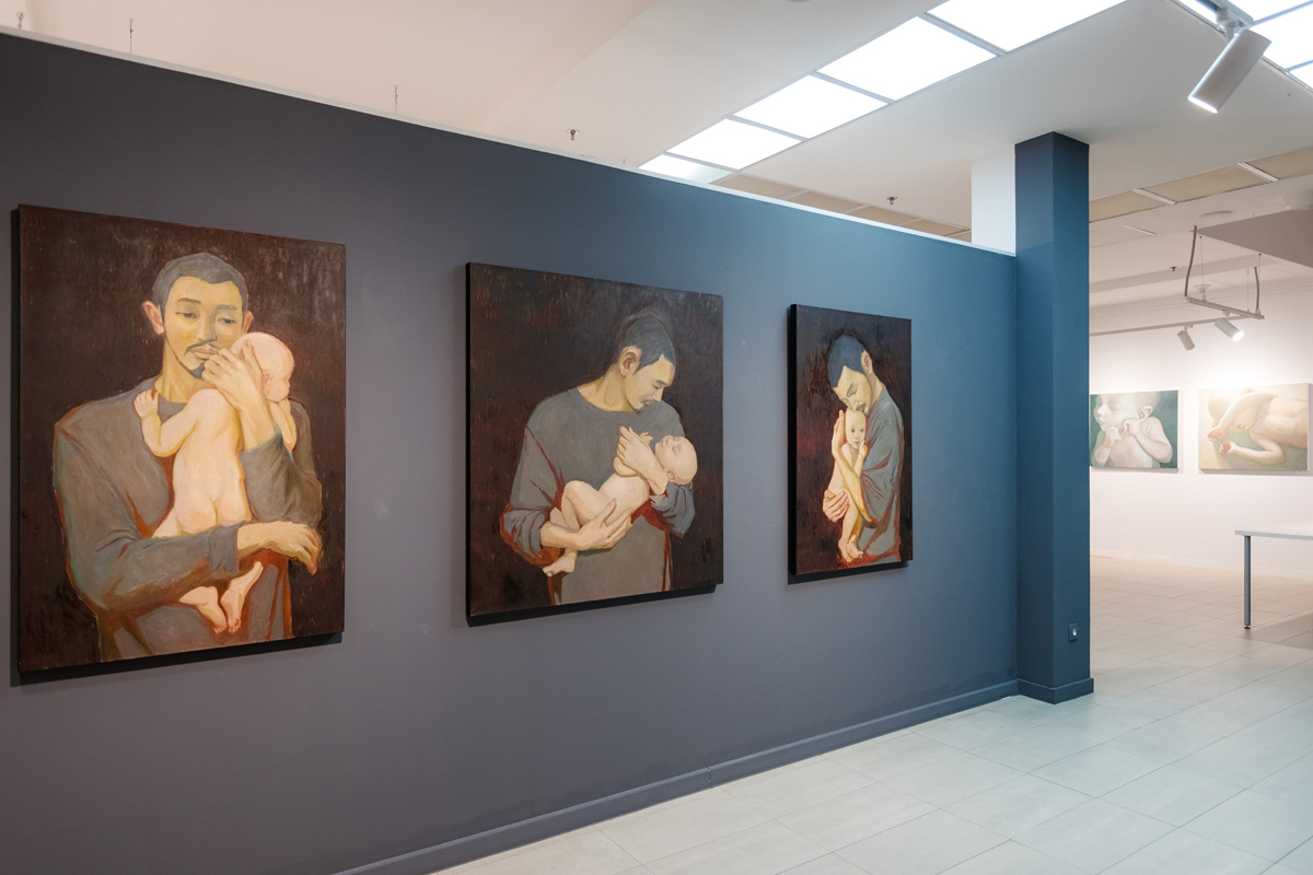 Но в целом настроение выставки очень позитивное. Евгения Байгалиева рассказывает о своих взаимоотношениях с мужем и сыном. Это крутая троица художников: малыш Жан уже пишет картины, у него такие мощные абстракции получаются! Родители даже завели маленькому художнику отдельную страничку в соцсетях, где показывают его картины. Работы Евгении, представленные на выставке, посвящены совместным ритуалам, семейным ценностям, заботе о ребенке, островку безопасности и комфорта, который они сами создают. Большое внимание Женя уделяет именно взаимоотношениям папы и сына. Но это не все контексты, с которыми работает Евгения, по первому образованию она социолог и в своих работах исследует дуальное, непроявленное, символическое, и главным объектом изучения и анализа становится общество во всех его проявлениях и состояниях.