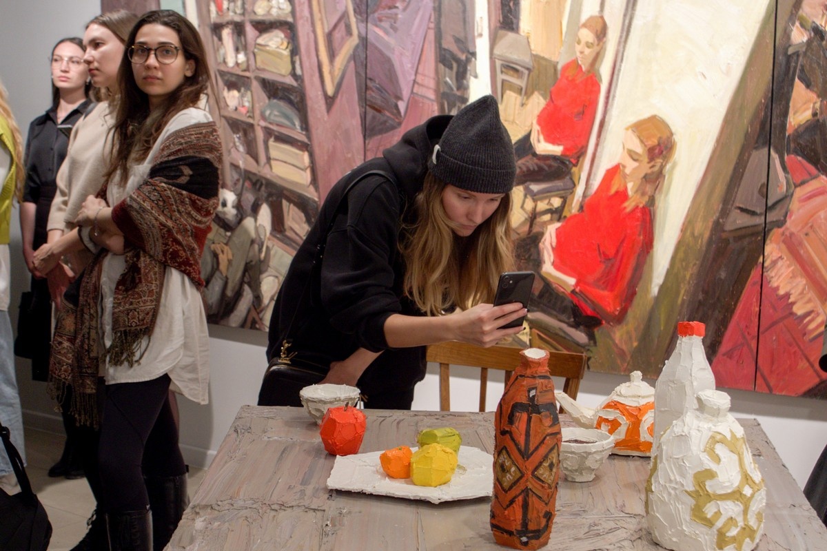 Многие работы мне уже были знакомы, но были и новые, что-то создавалось прямо специально для выставки, мы вместе отбирали эскизы. Я очень благодарна Ане, Ире, Саяну и Жене за вовлеченность и включенность в процесс: мы много говорили о концепции выставки, делились историями, обсуждали смыслы. Нам важно показать в «БИЗОNе» живые и актуальные работы, согреть теплом и окружить заботой зрителей галереи. Есть, кстати, даже «звездные работы». Саян, например, предоставил для выставки стол, вазы, фрукты и столовые приборы, выполненные в авторской технике, и, как любители искусства наверняка успели уследить, часть из этих объектов была представлена на открытии нового сезона «Открытых студий» «Винзавода» и даже засветилась на Первом канале, а некоторые скульптурные композиции художник сделал специально для выставки «Я рядом. Яратам».
