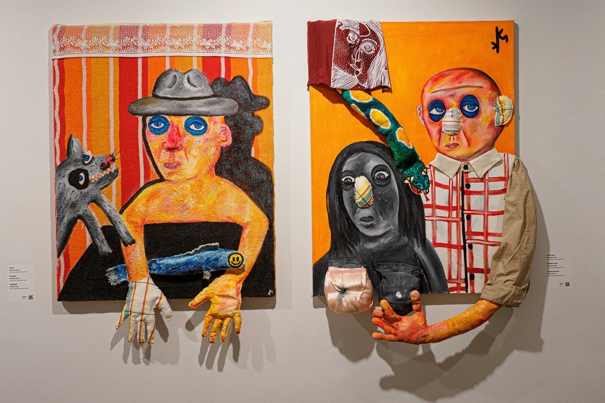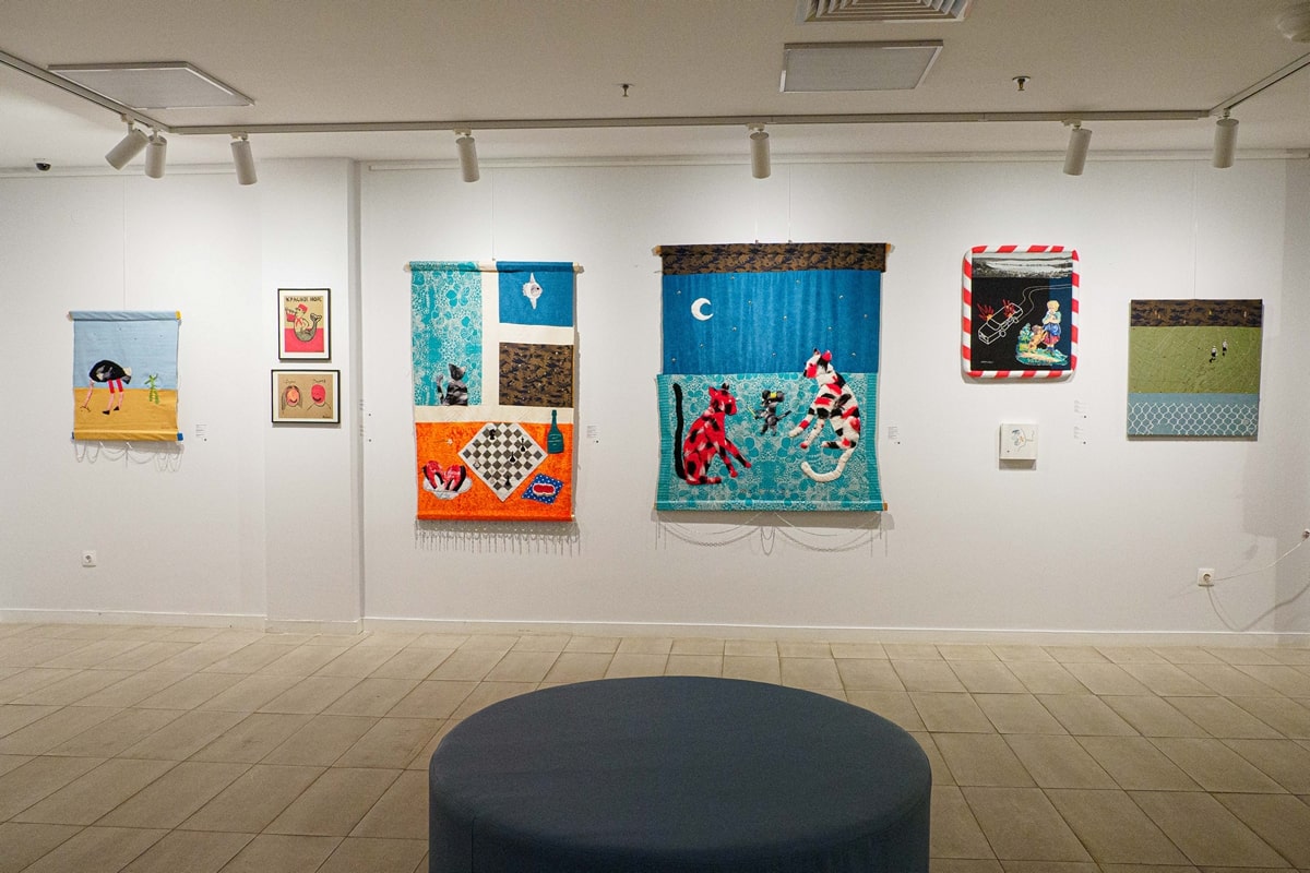 На двух этажах галереи представлены как традиционные живописные работы, так и разного рода арт-объекты: от синтепоновых ног до кафельной плитки, от бра и мозаики до деревянных инсталляций и подушек, связанных телефонным проводом.
