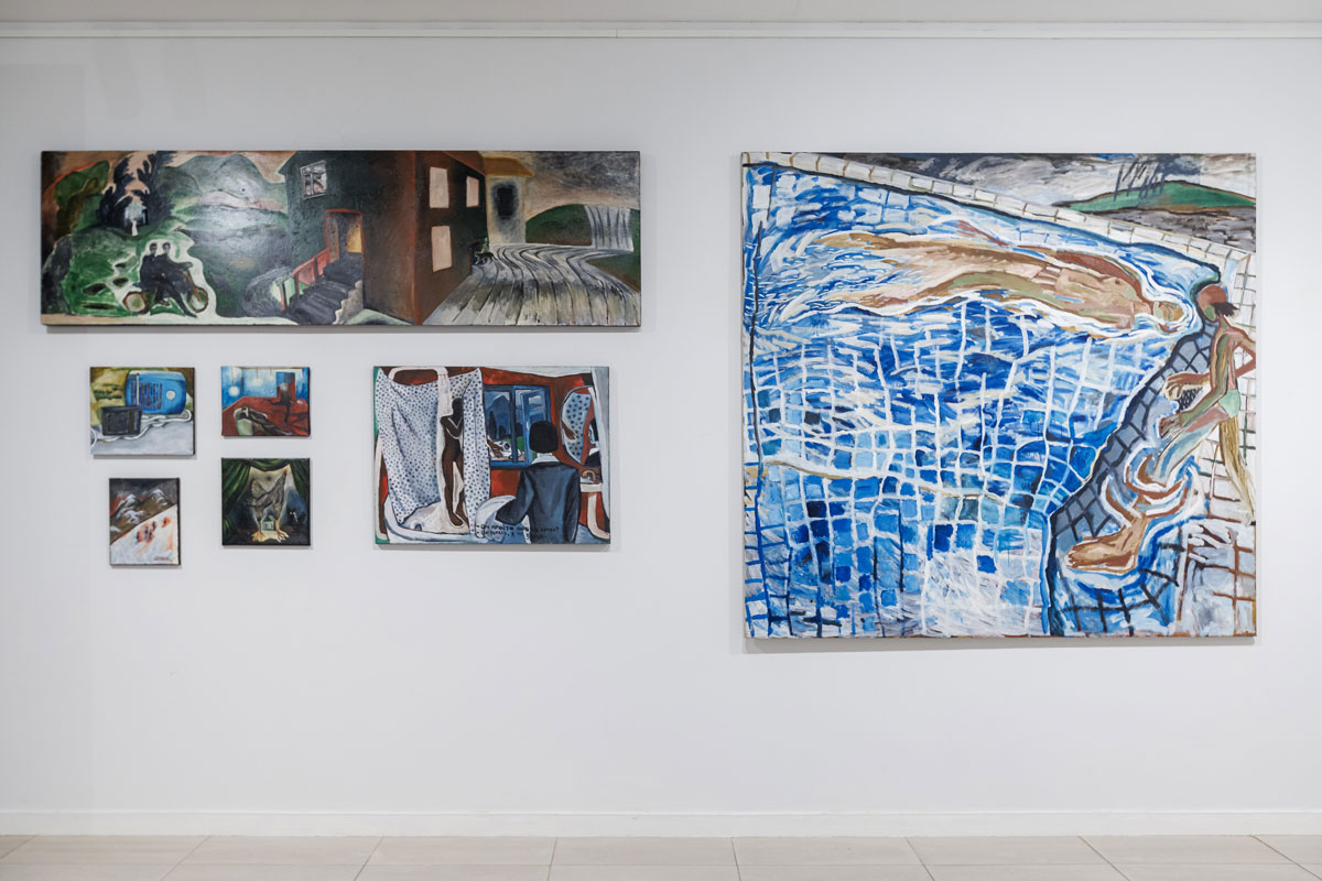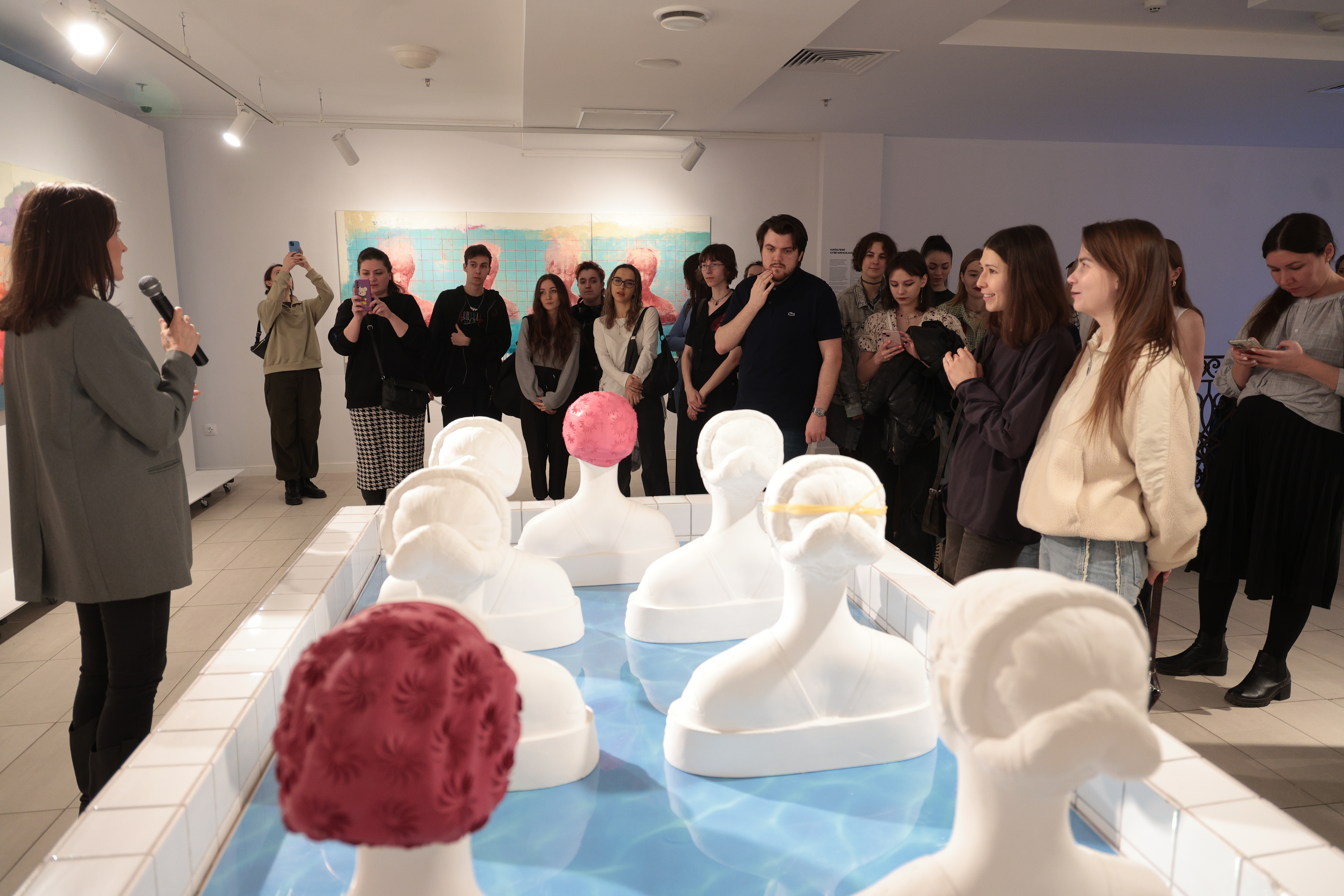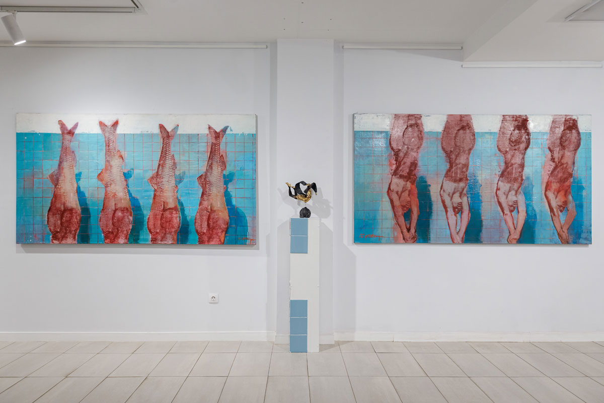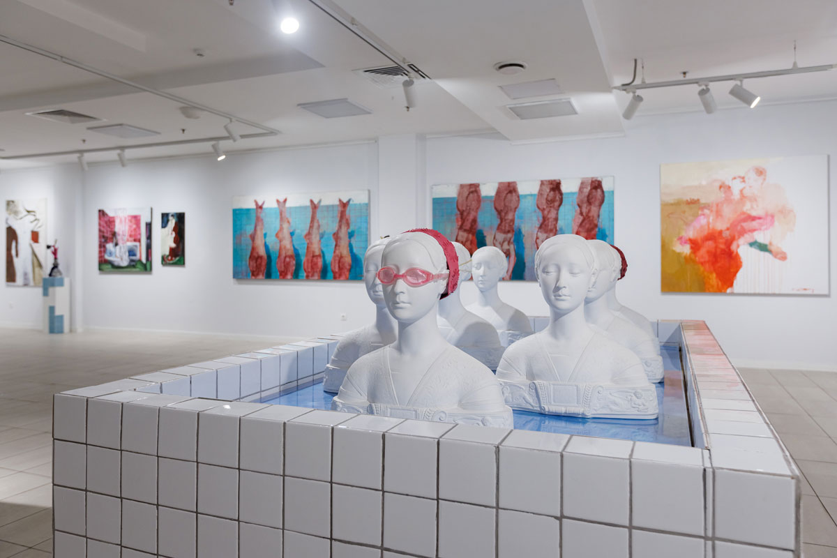 Три художницы — Гаянэ Аветисян, Наталия Спечинская и Ольга Цимболенко — отвергают скучную реальность, прославляют мир фантазии, пребывают в поисках новой нездешней красоты. Погружение под воду ныряльщиков Спечинской метафорично можно сравнить с исцеляющим эскапизмом. Под толщей воды до нас едва доносятся звуки внешнего мира, там лишь потусторонний гул. В этом смысле инсталляция «Бассейн» служит своеобразным порталом — как кроличья нора Алису, она отправляет нас в художественный мир трех женщин. Здесь интерпретации, череда воспоминаний и флешбеков наслаиваются, расходятся кругами по воде.