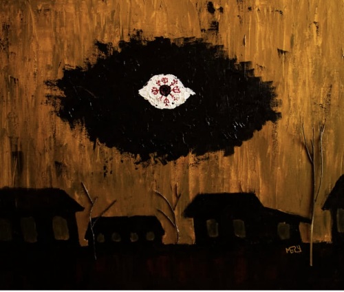 холст, акрил, клей, сухостой из ныне не используемой для обрядов священной рощи, 70х60, 2024