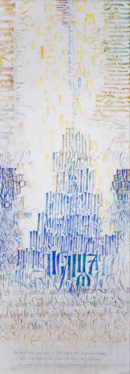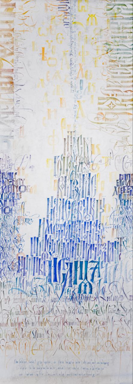 бумага, акрил, гуашь, чернила, каллиграфия древнерусским уставом, скорописью и вязью, 300х100, 2022