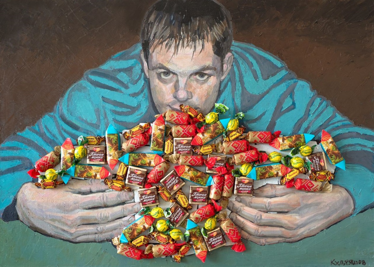 холст, акрил, масло, двойной скотч, конфеты, 50х70, 2023